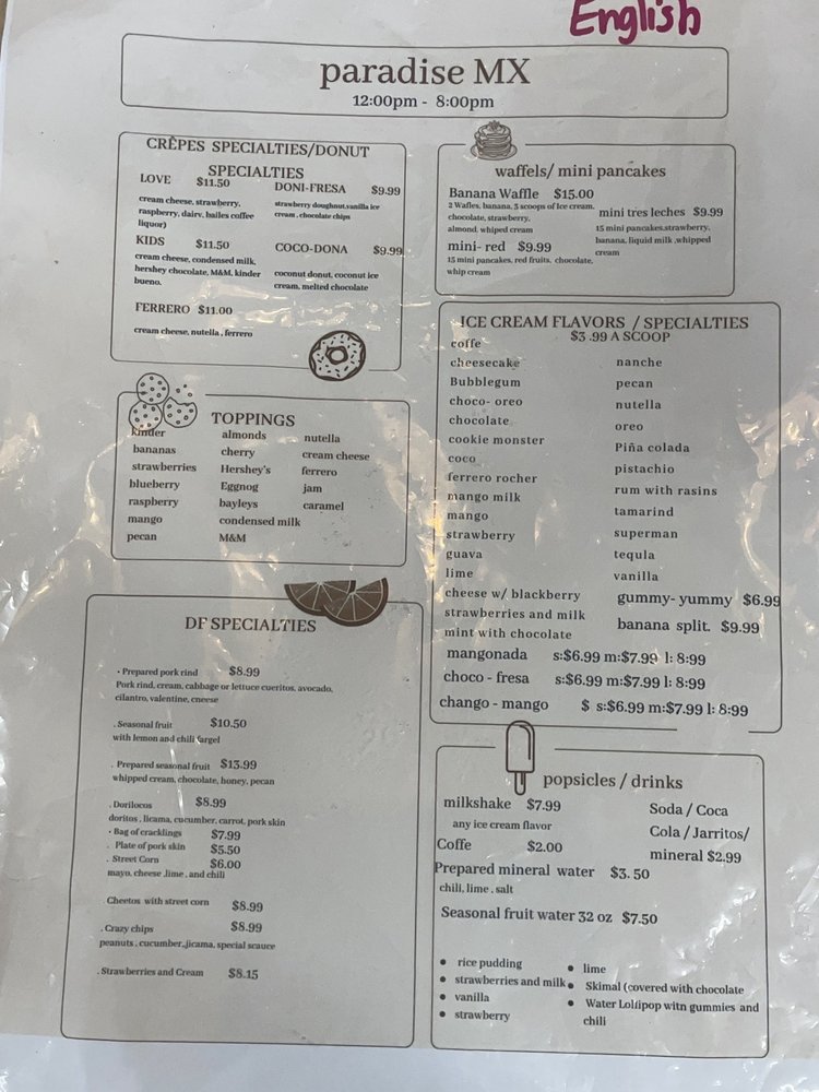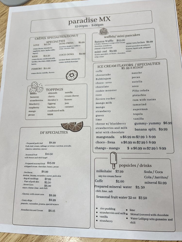 Introducing Paradise mx, a vibrant culinary gem in Indianapolis that promises a delightful fusion of tastes. Nestled at 7045 Emblem Dr, this establishment specializes in an array of enticing donuts and Mexican specialties. Their signature item, the CocoDona, features a coconut donut paired with luscious coconut ice cream and a chocolate drizzle, inviting you to indulge in a tropical escape. Fellow favorites like the DoniFresa showcase the sweet charm of strawberries atop vanilla ice cream, complemented by playful rainbow sprinkles.
